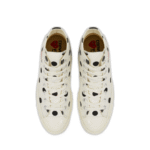 Step into timeless streetwear fashion with the CDG Play Converse Polka Dot Red Heart Chuck Taylor All Star ’70 High Sneakers. This iconic collaboration between Comme des Garçons Play and Converse redefines the classic Chuck Taylor silhouette with a playful yet stylish twist. Featuring the signature black canvas upper adorned with bold white polka dots, these sneakers showcase Rei Kawakubo’s minimalist yet creative design vision. The standout detail is the signature red heart logo with two eyes, instantly recognizable as the emblem of CDG Play.